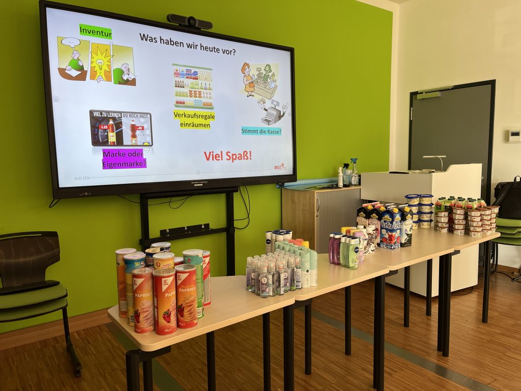 Die Wirtschaftler beschäftigten sich mit den Tätigkeiten im Einzelhandel. Dabei führten sie in Gruppen eine Inventur durch, räumten Regale nach bestimmten Kriterien ein, verglichen Markenprodukte mit Eigenmarken von Lebensmittelketten und überprüften die Kasse.