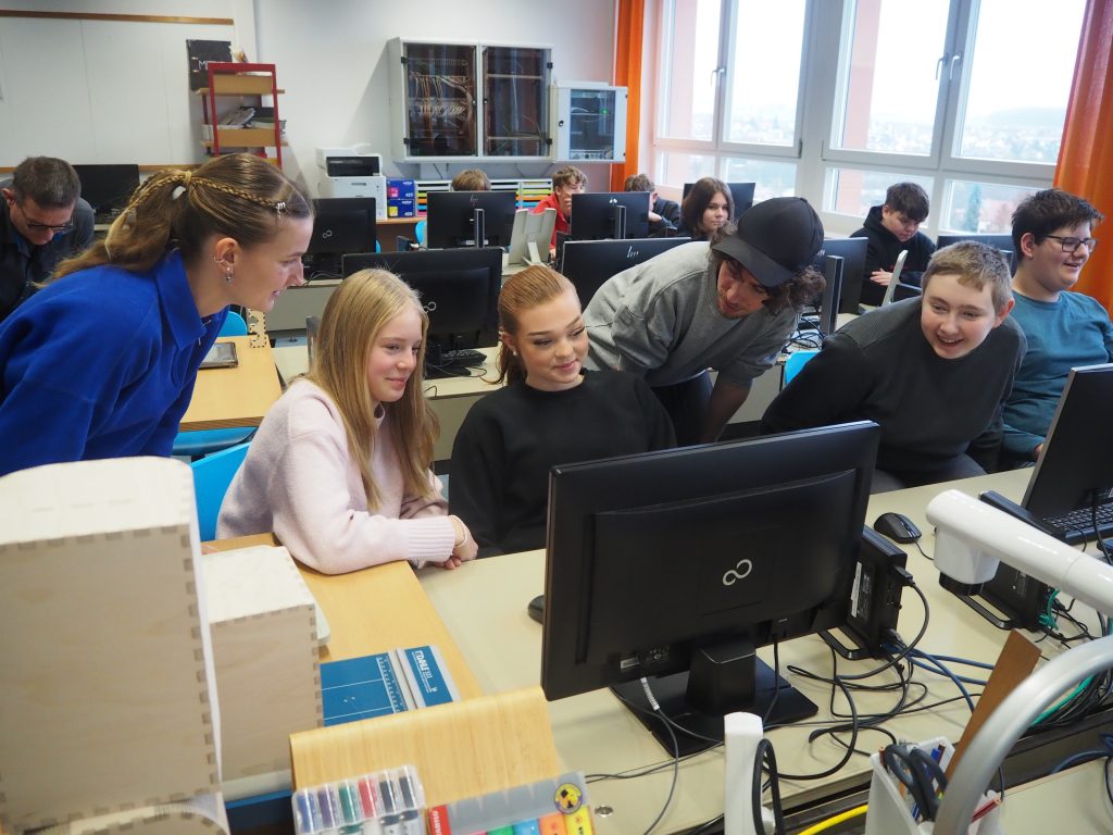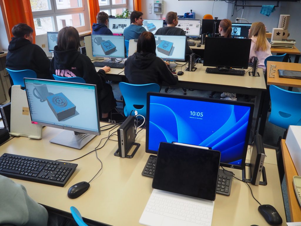Mit der Software KYUB entwickelten die Schülerinnen und Schüler am digitalen Tag angeleitet vom Team der Firma eigenständig die Designs für ihre ganz persönliche Cajon. Sie passten die Formen an, fügten individuelle Grafiken und Bilder hinzu und gestalteten die Öffnungen nach eigenen Vorstellungen. Hochkonzentriert und voller Kreativität setzen sie ihre Ideen um und schufen beeindruckende 3D-Modelle.