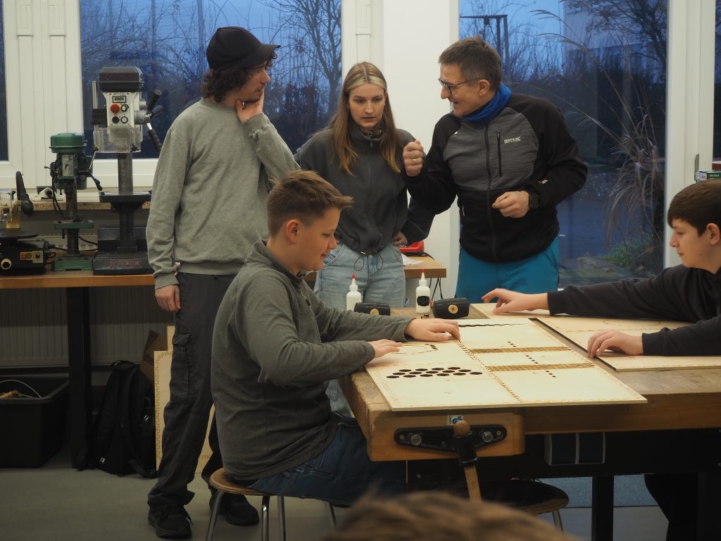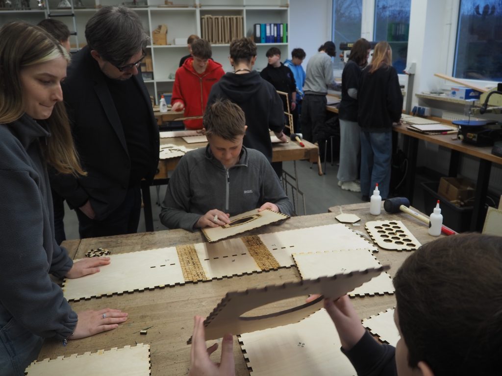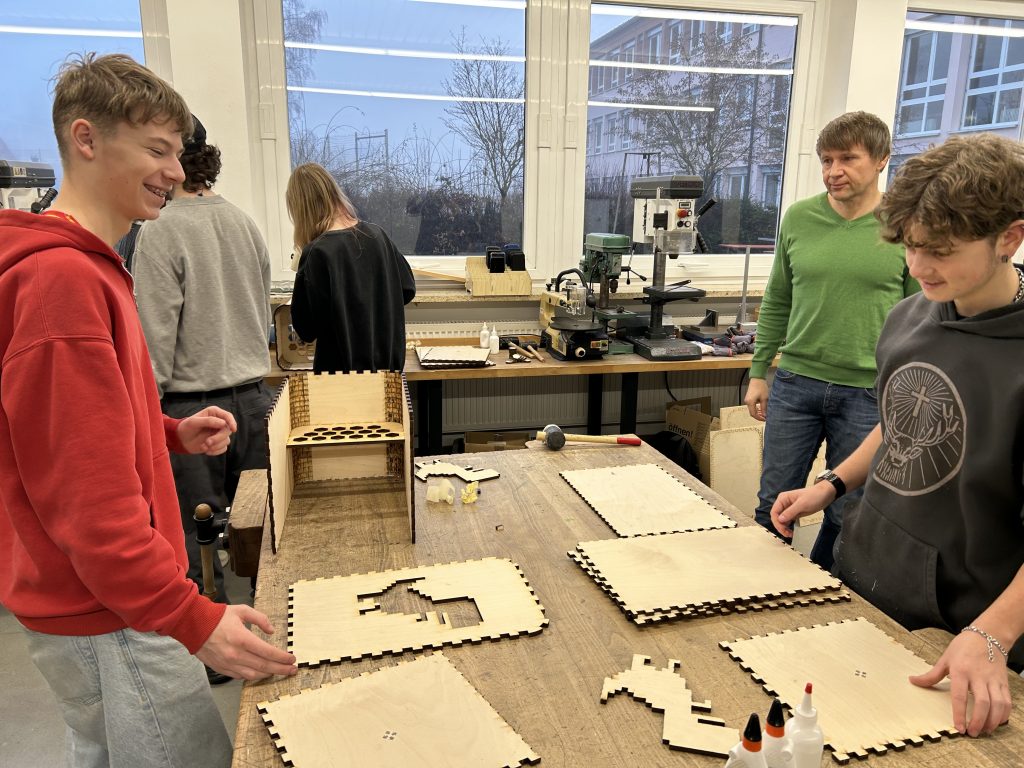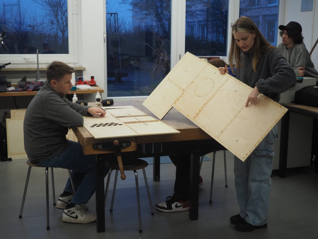 In einem zweiten Teil des Workshops bauten die Schülerinnen und Schüler ihre Cajons am Praxistag selbständig zusammen. Dazu mussten die Formen vorsichtig aus den Holzplatten geklopft werden, der Baukörper gebogen und verleimt werden. Abschließend ging es dann ans vorsichtige Schleifen der Oberflächen, bevor diese mit Öl oder Wachs behandelt werden konnten.