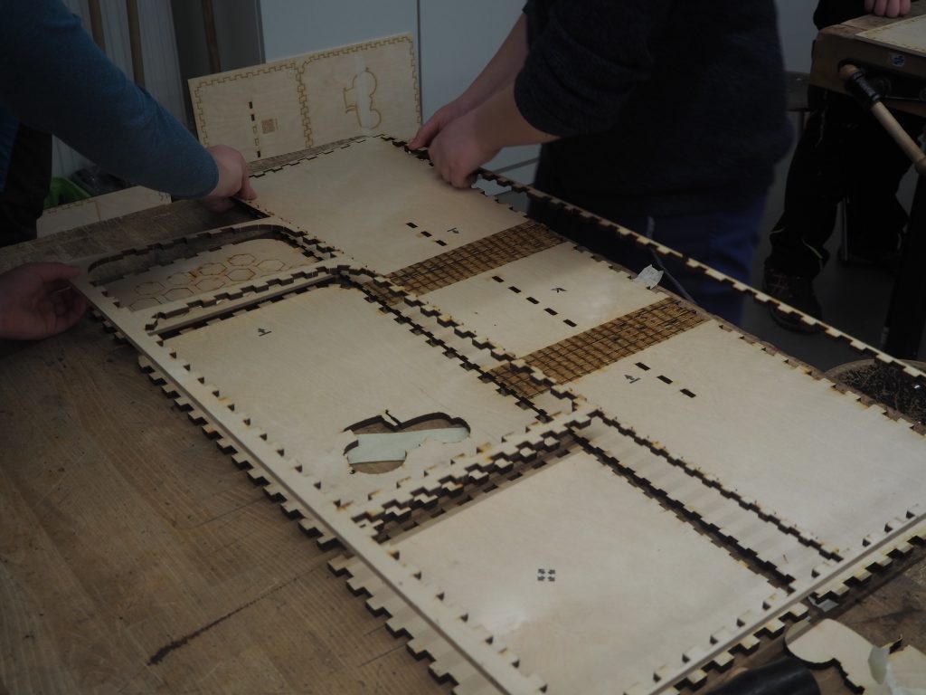Die fertigen Entwürfe wurden anschließend durch einen externen Dienstleister mit einem Lasercutter präzise in Holzplatten geschnitten.