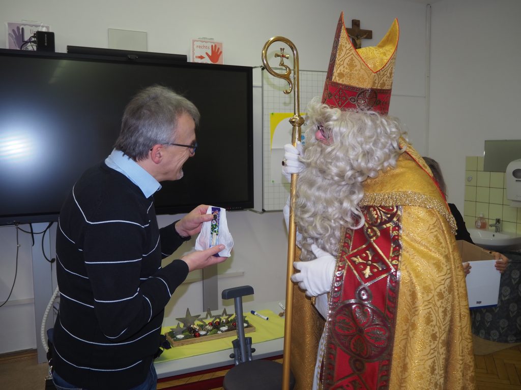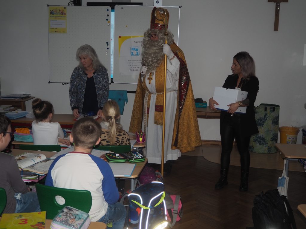 In jeder Klasse verteilte der Heilige zusammen mit seiner himmlischen Gehilfin als Belohnung Geschenke. Er überreichte jedem Kind eine Tüte, in der jeweils ein Apfel, zwei Mandarinen und ein Schokoladen-Nikolaus eingepackt waren. Die Augen der Kinder leuchteten, als sie ihre Gaben in den Händen hielten, und es wurde fröhlich geplaudert und gelacht. Der Nikolaus verabschiedete sich mit den besten Wünschen für eine besinnliche Advents- und Weihnachtszeit.