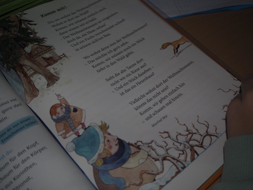 Viele Klassen sangen das Lied „Lasst uns froh und munter sein“, von den Lehrerinnen auf der Gitarre begleitet oder ohne Begleitung. Es war das Lieblingslied des Heiligen Nikolaus. Ein Mädchen trug ein lustiges Nikolausgedicht vor. Eine Klasse las Nikolausreime in abwechselnden Gruppen im Chor. „In der Weihnachtsbäckerei“ konnte der Nikolaus in Liedform hören, welch lustige Dinge sich dort beim Plätzchenbacken ereignen. „Feliz Navidad“, für das sich eine der beiden vierten Klassen entschied, sei eines der Lieder, das er nicht so oft höre, wusste der Heilige zu berichten.