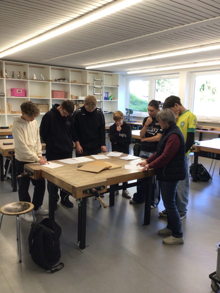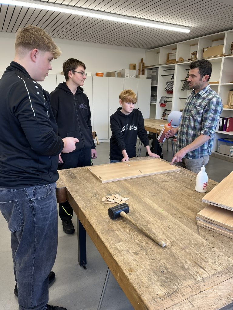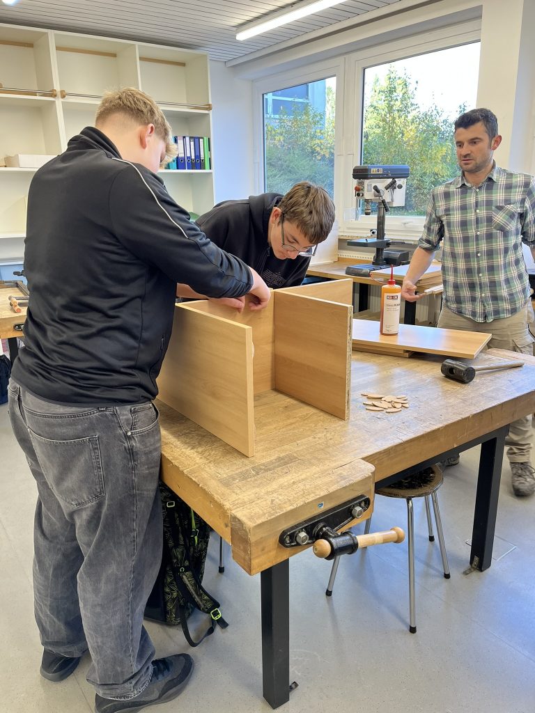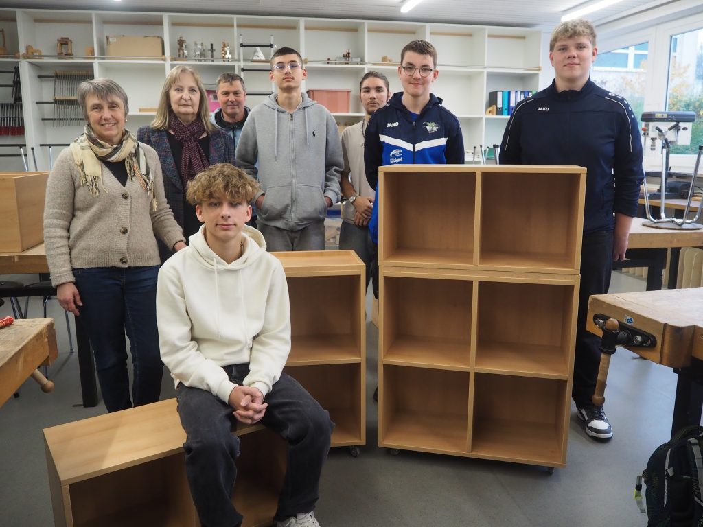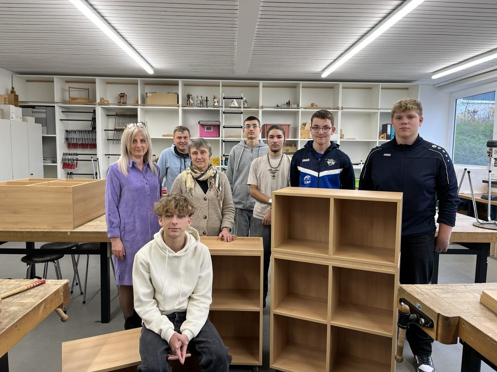 Die Technik-Gruppe war mit Interesse und Einsatz dabei. Die Schüler konnten sich den ein oder anderen Trick von den Profis abschauen und die Tätigkeiten eines Schreiners praxisnah kennenlernen. Die drei fertigen Regale werden an Grundschulklassen verteilt.