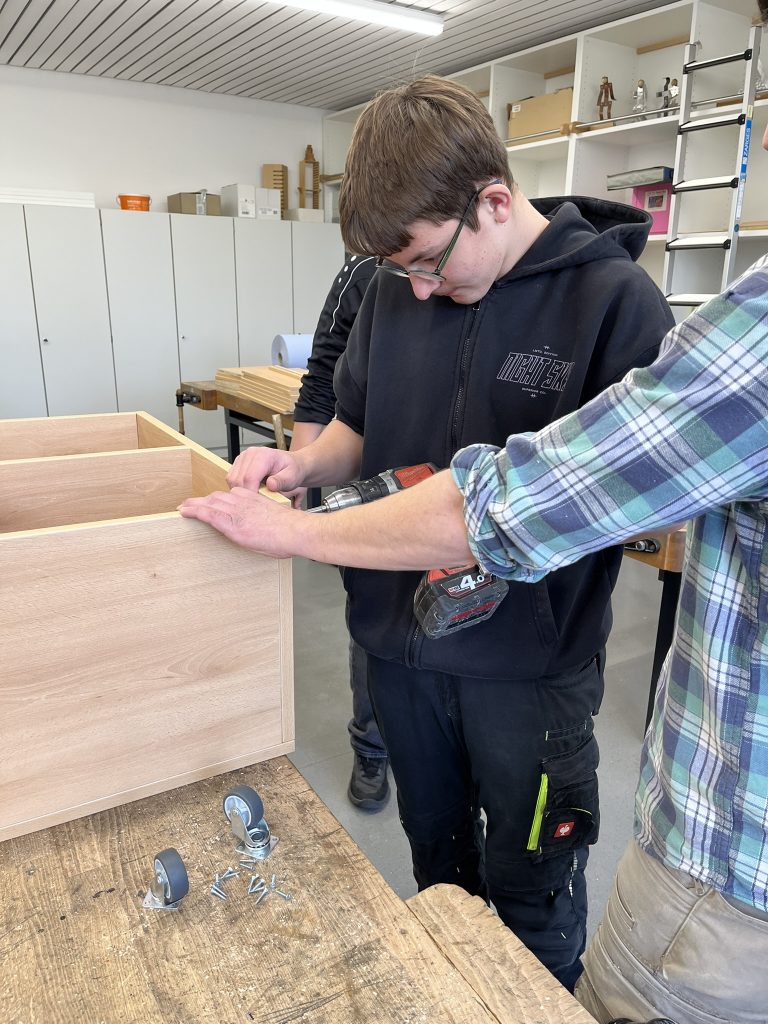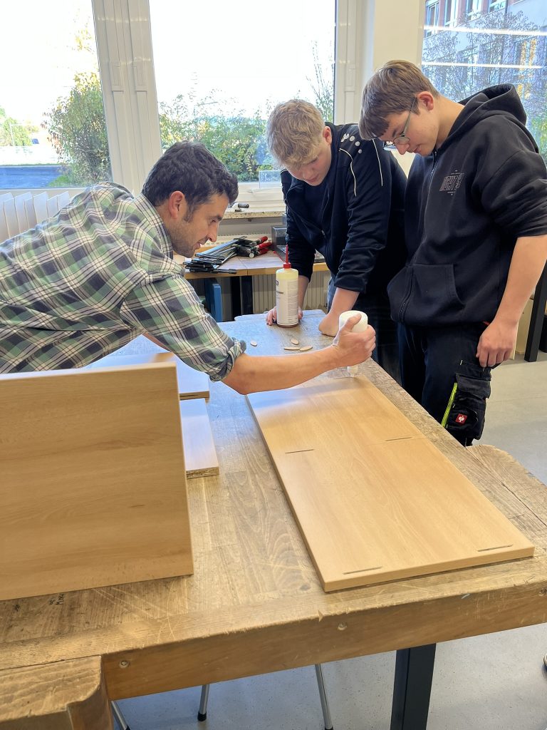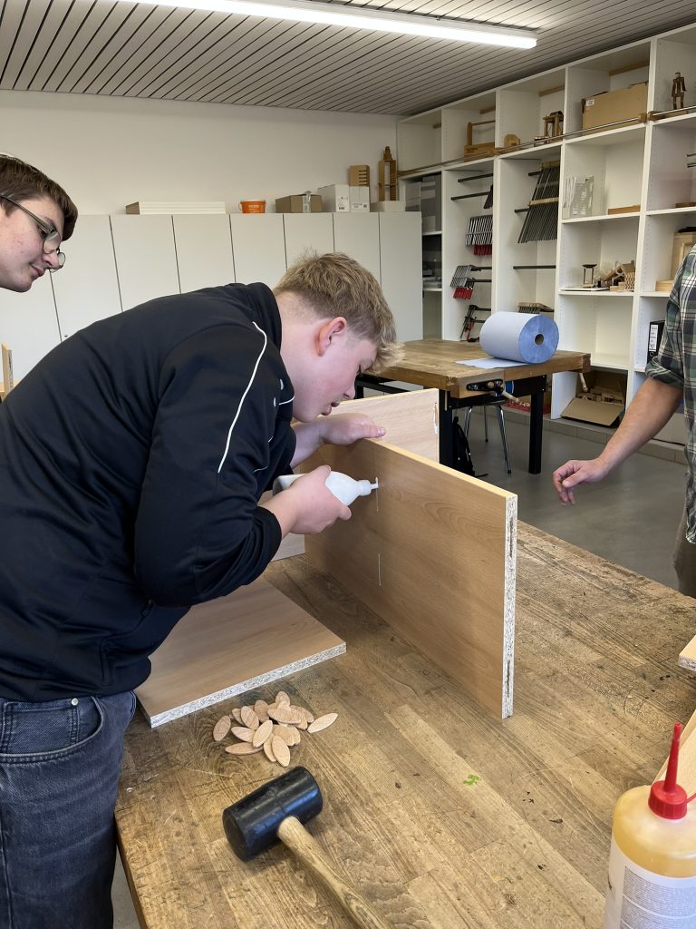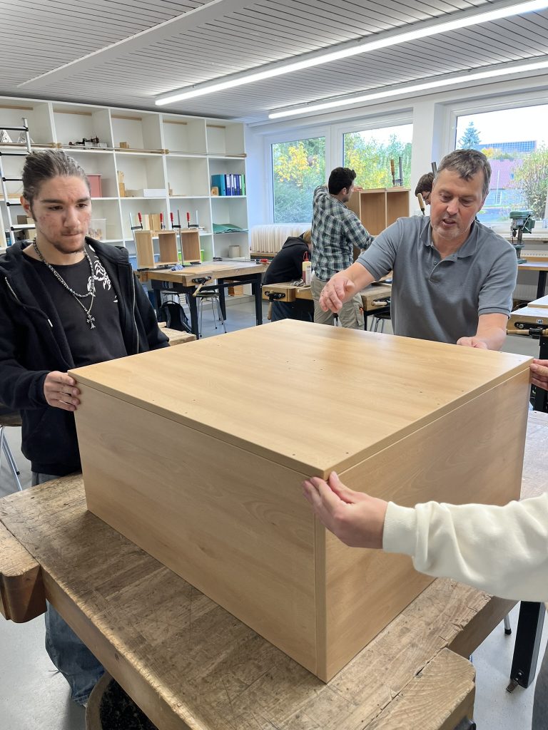 In diesem Schuljahr konnten die Schüler im Werkraum der Schule die Regale zusammenbauen. Mitarbeiter der Schreinerei Kreuzer brachten Material und einzelne Werkzeuge mit und wiesen die Schüler bei der Montage an: Leimen, Spannen, Messen, Anreißen, Bohren, Montieren, Rollen anbringen. Anschließend wurden die fertigen Regale einer Funktionskontrolle unterzogen, die sie natürlich bestanden haben.
