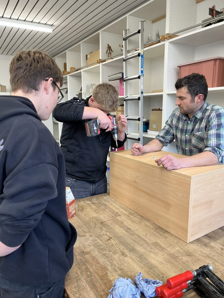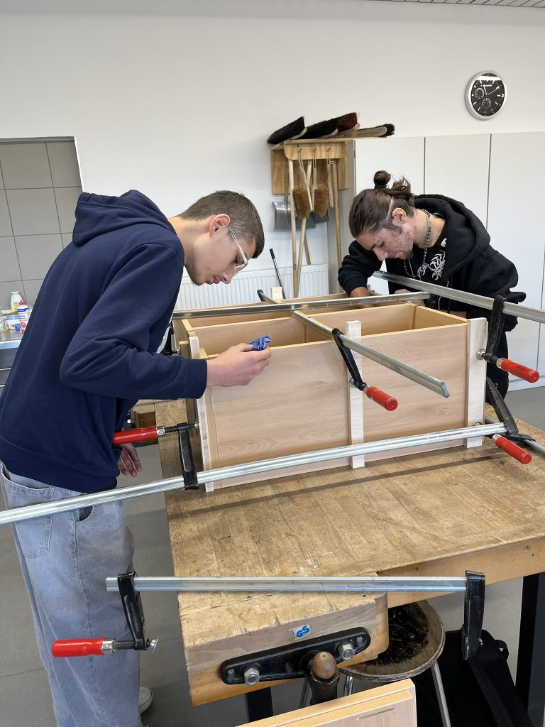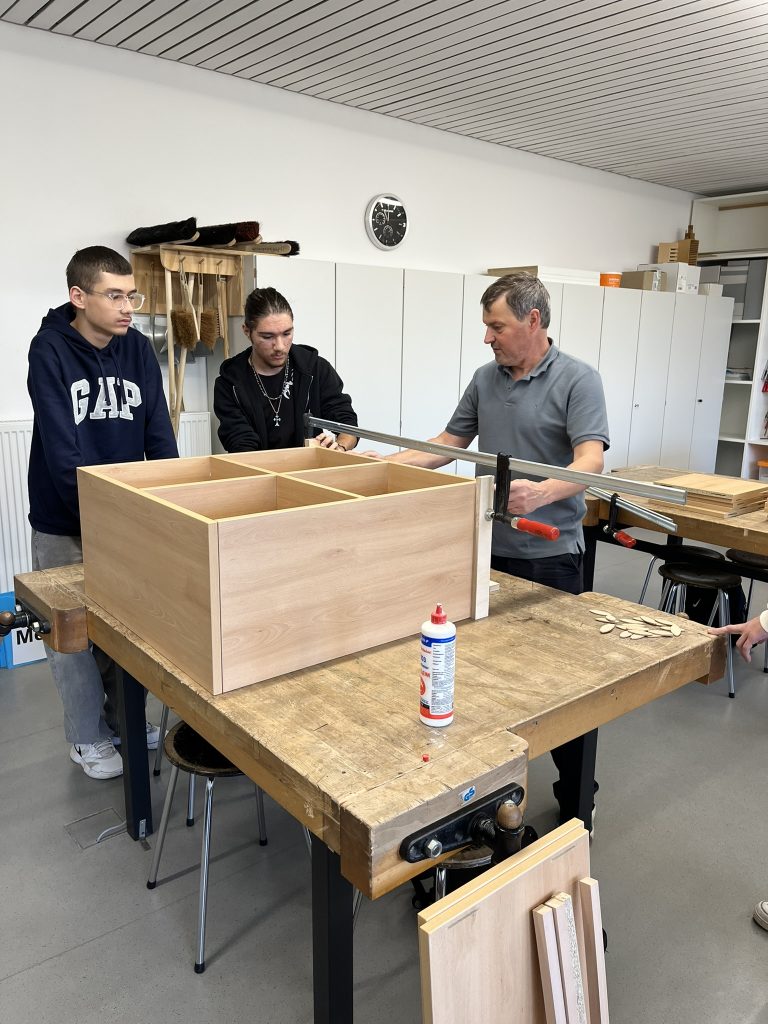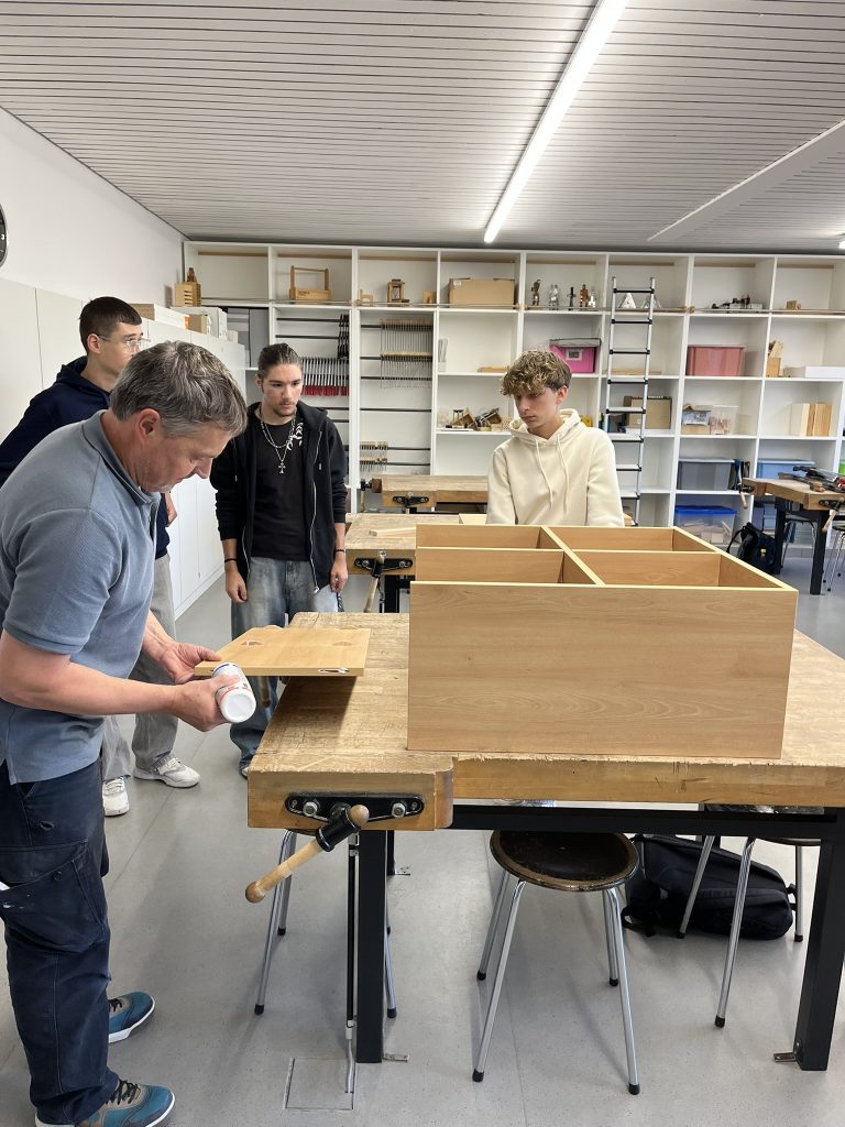 In diesem Schuljahr konnten die Schüler im Werkraum der Schule die Regale zusammenbauen. Mitarbeiter der Schreinerei Kreuzer brachten Material und einzelne Werkzeuge mit und wiesen die Schüler bei der Montage an: Leimen, Spannen, Messen, Anreißen, Bohren, Montieren, Rollen anbringen. Anschließend wurden die fertigen Regale einer Funktionskontrolle unterzogen, die sie natürlich bestanden haben.