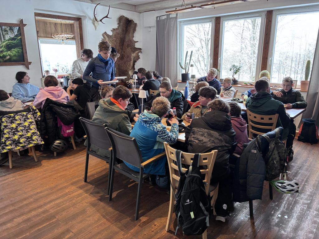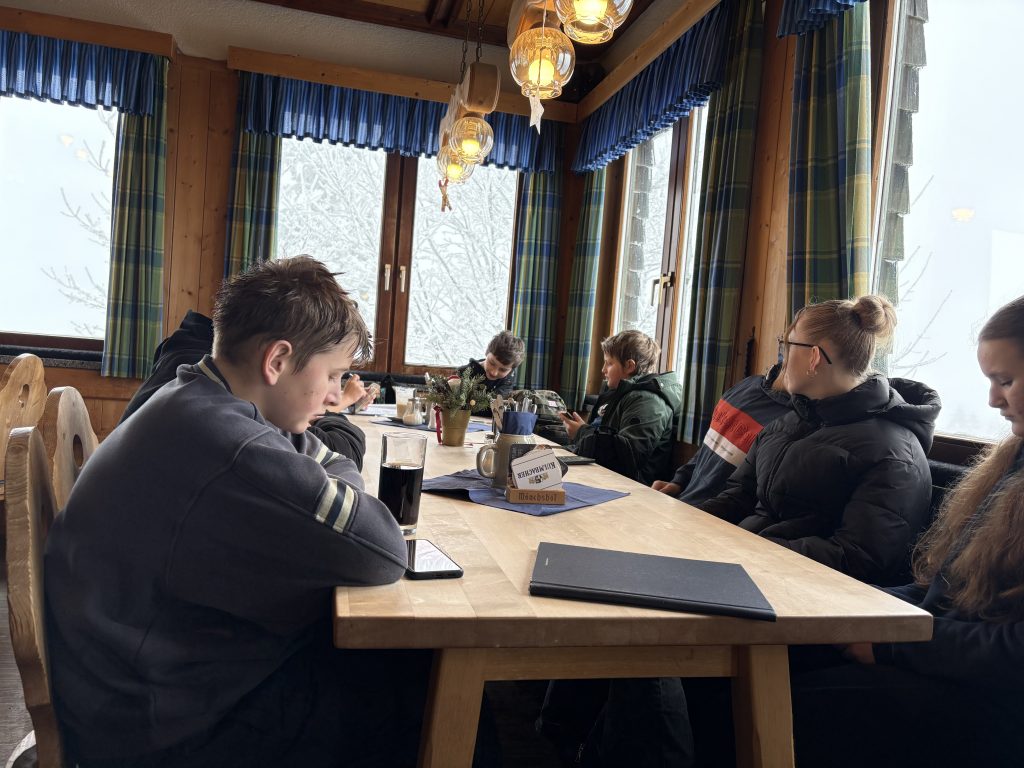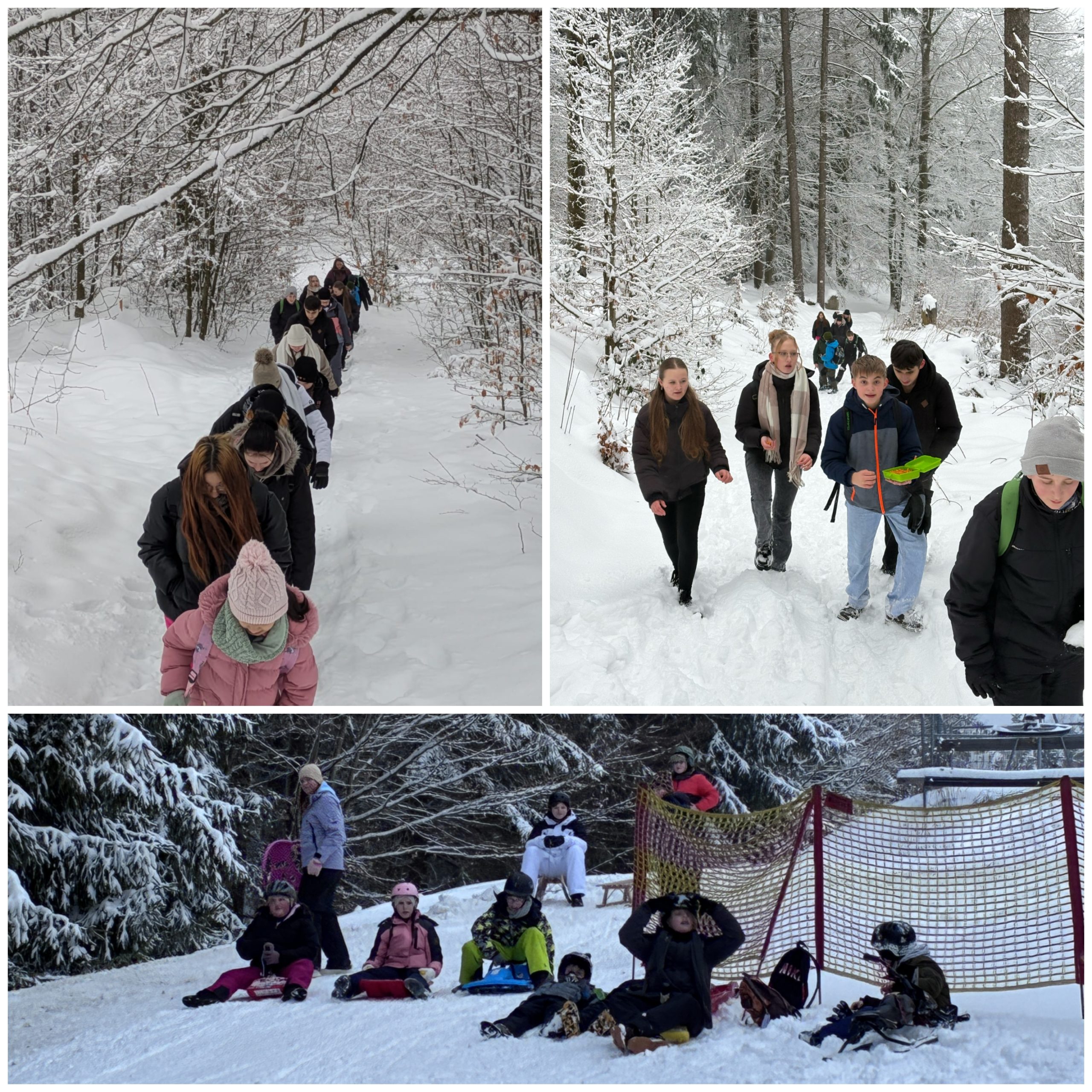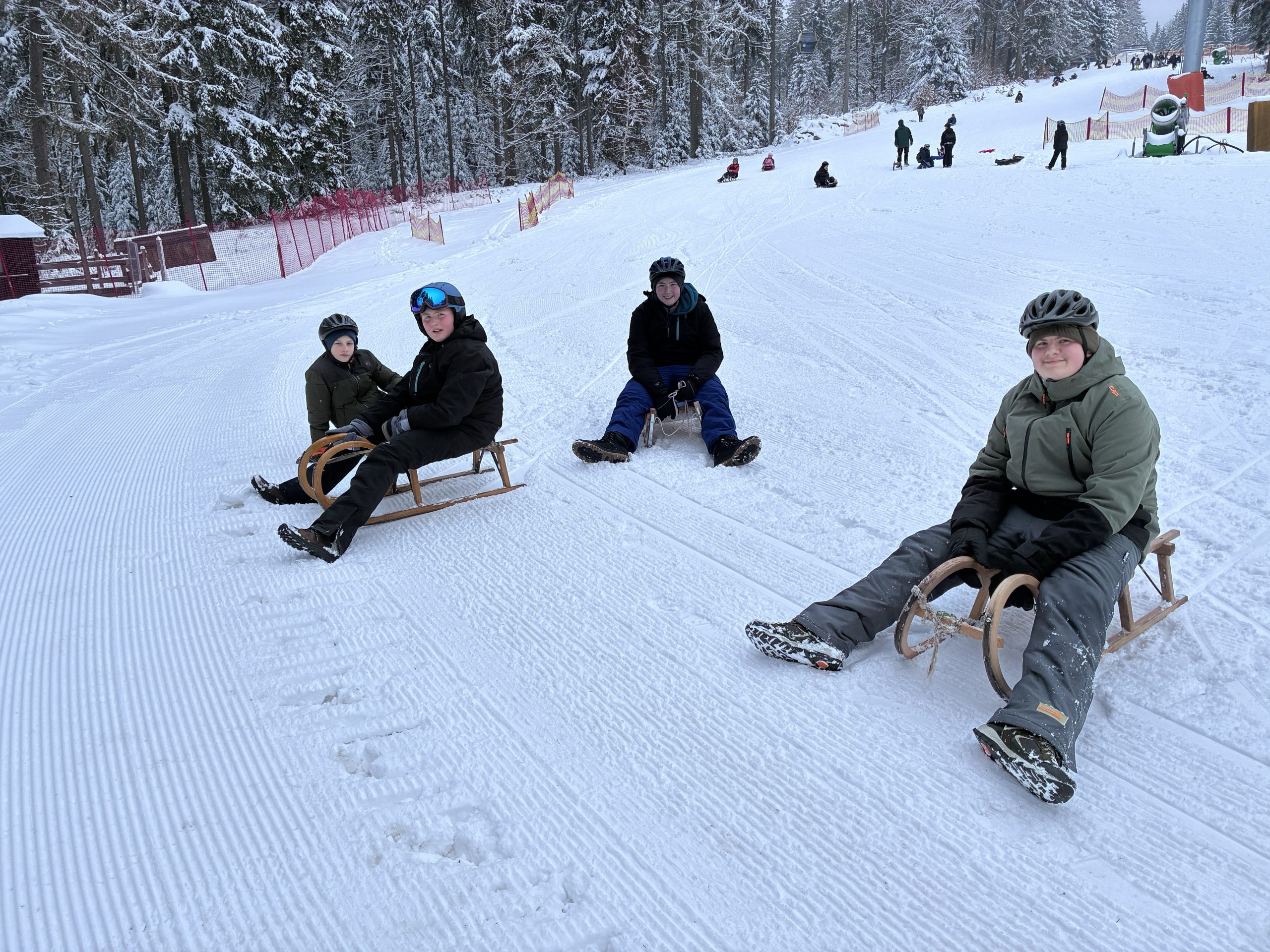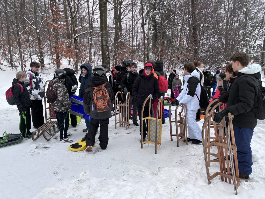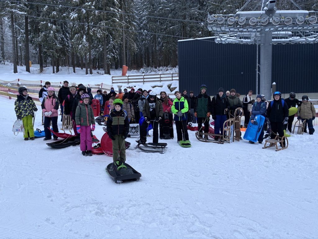 Die zweite Gruppe zog es zur Talstation Süd am Ochsenkopf. Am Rodelhang in Fleckl wartete eine bestens präparierte, rund 150 Meter lange Piste – ideal für flotte Abfahrten, kleine Wettrennen und jede Menge Schneespaß. In der verschneiten Landschaft war die Stimmung ausgelassen. Zur Stärkung kehrte die Gruppe im Bullheadhouse ein; Pommes und Chicken Nuggets schmeckten dann besonders gut.