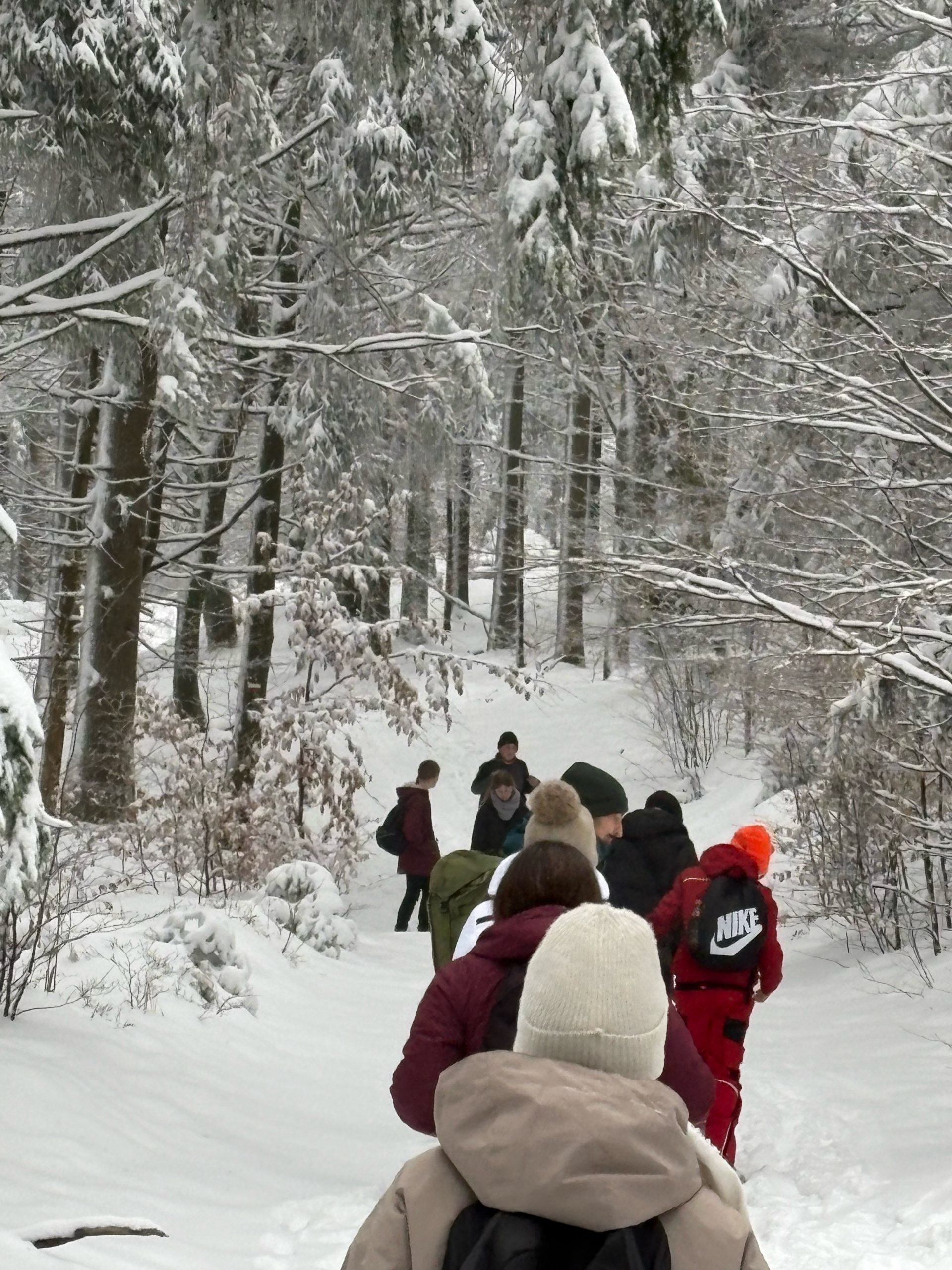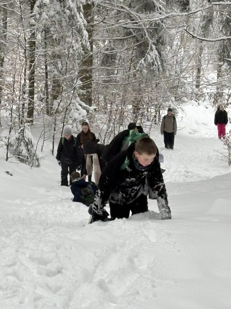 Vom Wanderparkplatz Kösseine aus startete die erste Gruppe zur Winterwanderung auf die Kösseine. Durch frisch verschneiten Wald führte der Weg stetig bergauf. Knirschender Schnee, vereiste Fichten und weite Ausblicke prägten die Tour. Auf dem Gipfel des Bergstocks angekommen, kehrten die Schülerinnen und Schüler zur Stärkung im Kösseinehaus ein und wärmten sich in gemütlicher Atmosphäre auf. Gestärkt konnte der Abstieg somit angegangen werden.